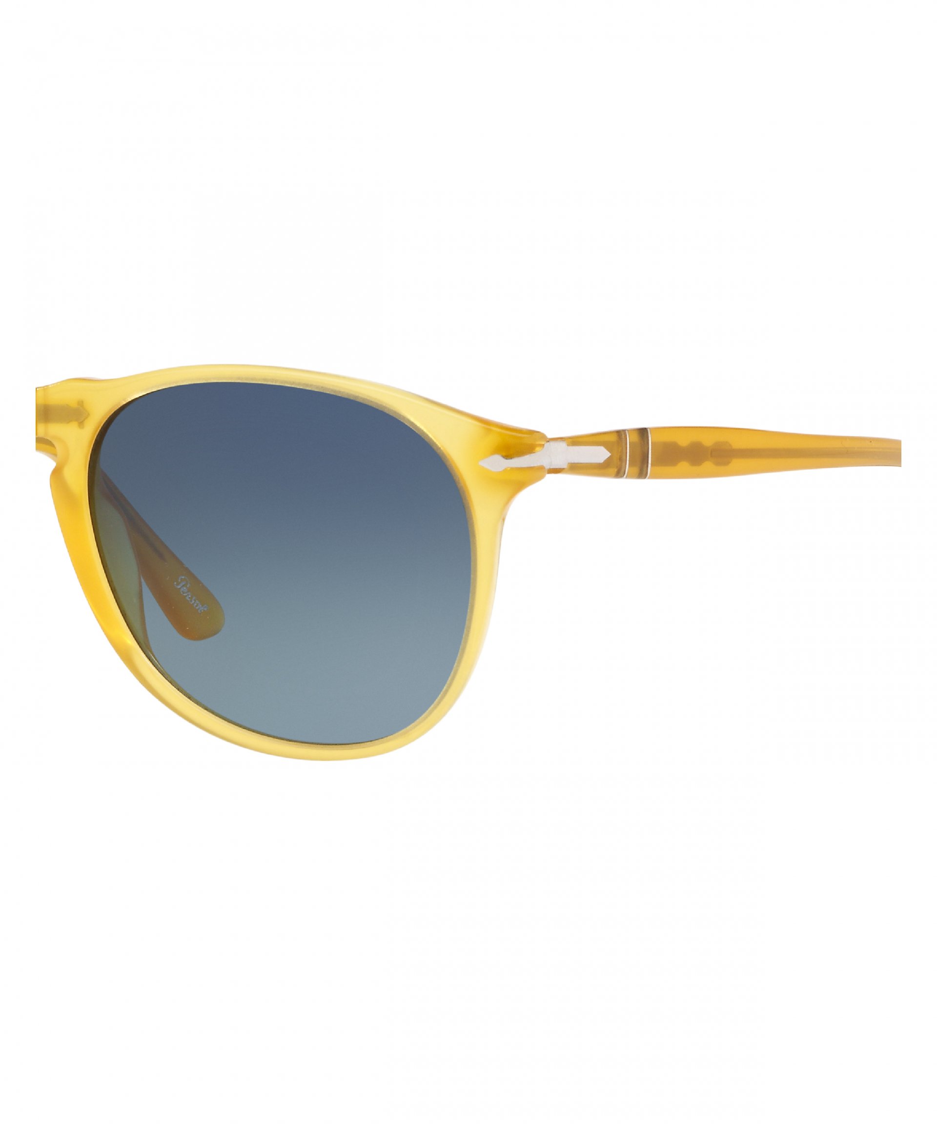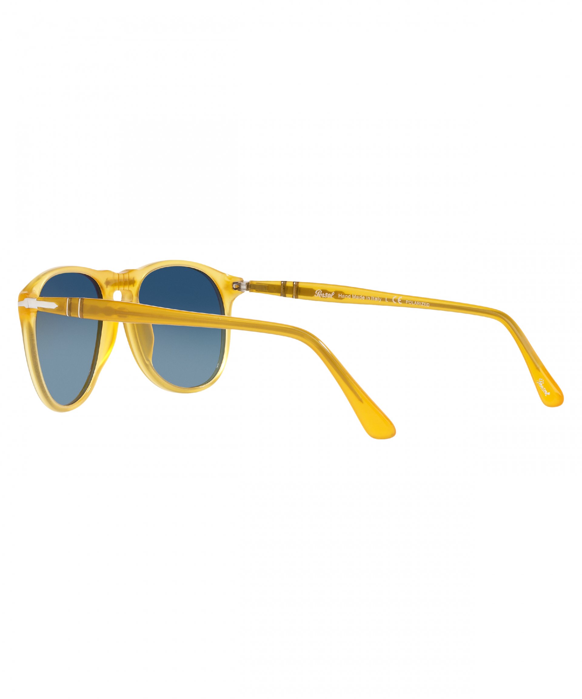 Óculos masculino modelo aviador fabricado em acetato na cor amarela e lentes polarizadas em cristal na cor azul gradiente.